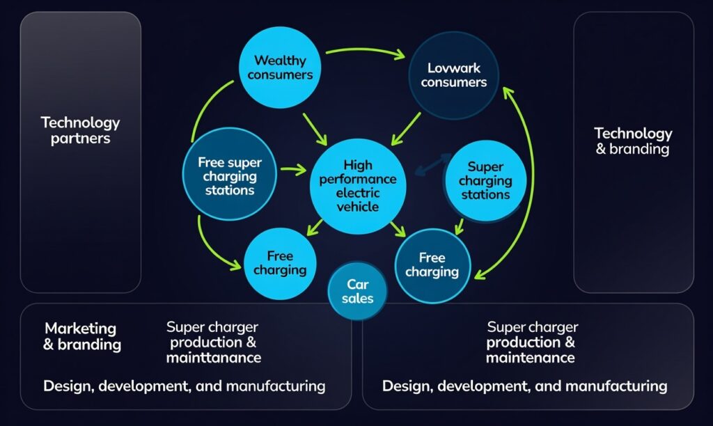 Before Tesla, the electric vehicle market was tiny and mostly filled with plain, practical cars. Tesla looked at that same market and saw a huge opportunity. Instead of competing on price or efficiency alone, Tesla focused on performance, design, and luxury. They aimed their first real product at wealthy, environmentally conscious buyers who wanted a great car—not just a “green” one.